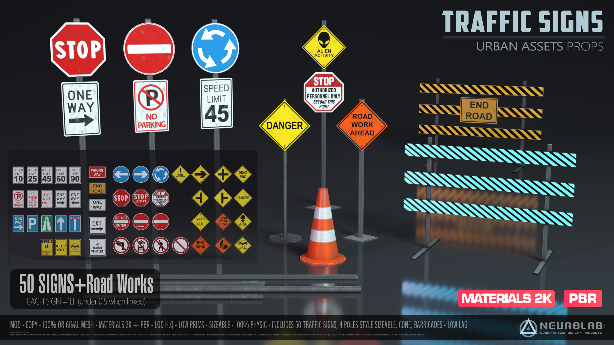Elevate your city build to new heights with the Neurolab Traffic Signs Kit. Immerse yourself in a world of realism and functionality, where every detail counts. Enhance the safety and navigability of your virtual streets with our high-quality, customizable traffic signs.