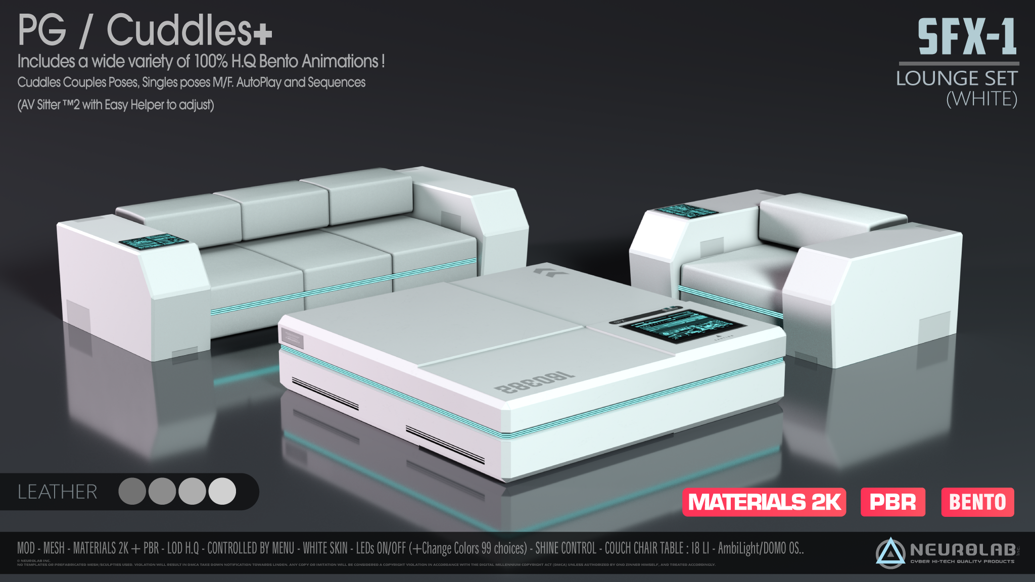 Introducing the Lounge Set SFX-1 from Neurolab, a modern and luxurious addition to your virtual lounge area. This high-quality lounge set is crafted with precision using luxury mesh and ultra-realistic materials (Materials 2K + PBR Versions), providing an immersive and realistic experience. With its sleek design and advanced features, the Lounge Set SFX-1 offers both comfort and style. Making it only 18 prims!