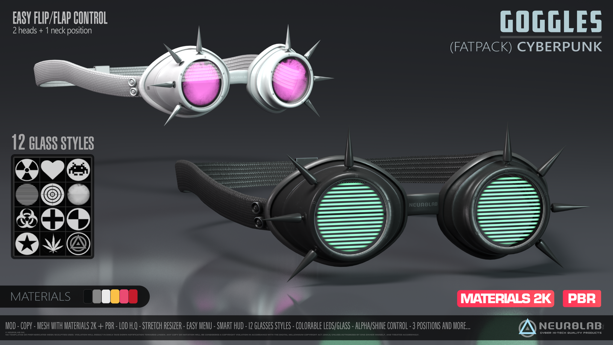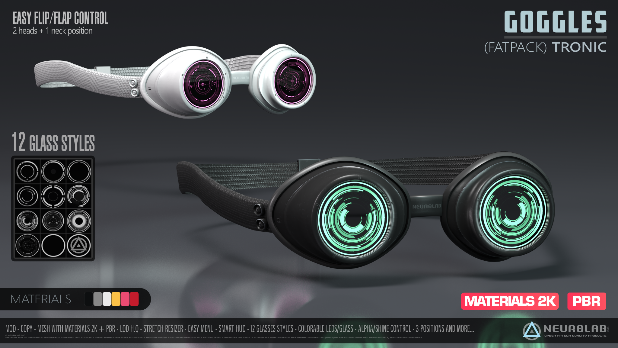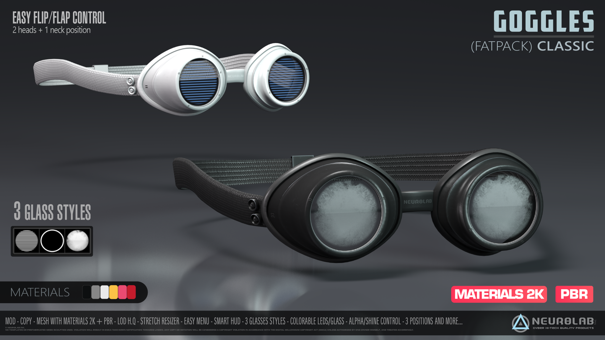 • [Neurolab Inc.] GOGGLES – Black – Permissions: Mod – Copy • [Neurolab Inc.] GOGGLES – White – Permissions: Mod – Copy • [Neurolab Inc.] GOGGLES – Red – Permissions: Mod – Copy • [Neurolab Inc.] GOGGLES – Pink – Permissions: Mod – Copy • [Neurolab Inc.] GOGGLES – Yellow – Permissions: Mod – Copy • [Neurolab Inc.] GOGGLES – Metal – Permissions: Mod – Copy • [Neurolab Inc.] N.PHONE SMART Customization HUD – Permissions: Copy